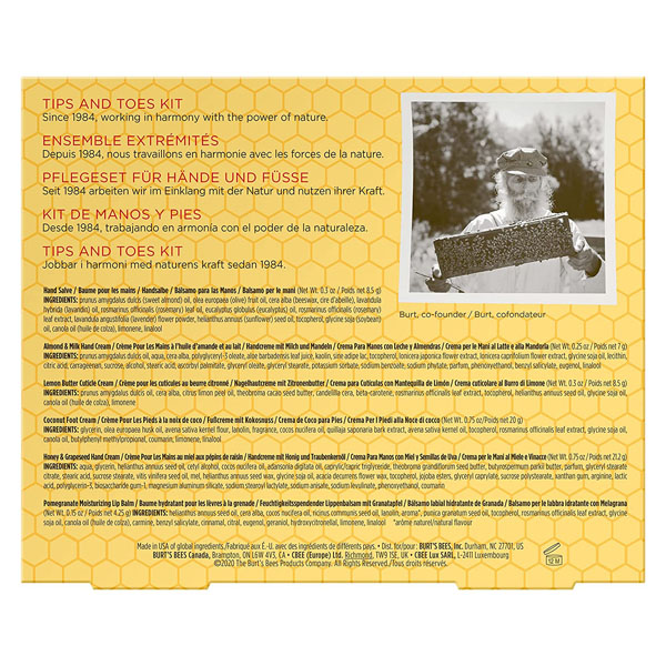 Give the gift of serious softening and hydration with Burt’s Bees Tips and Toes Gift Set. Included are five trial size versions of our popular hand and foot care favorites, plus a Pomegranate Lip Balm.