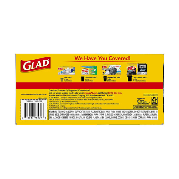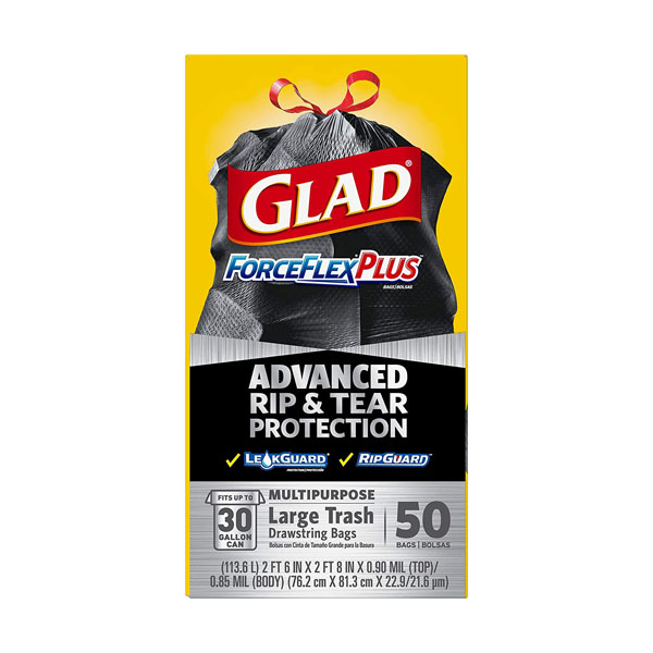 Glad ForceFlexPlus Drawstring Bags are designed with Durable Strength with a reinforced side seam to let you carry the heaviest loads without tearing the bag. The large capacity bags fit a 30 gallon can and stretche around your trash with the ForceFlexPlus technology to prevent rips and tears. Built with advanced rip and tear protection, the LeakGuard Protection and RipGuard Protection can withstand even the toughest and messiest trash, so that what goes in, stays in. The strong reinforcing drawstring closure grips the can and ensures easy closing and lifting with one quick pull. These garbage bags are perfect for tough jobs throughout your home or office, indoor or outdoor.