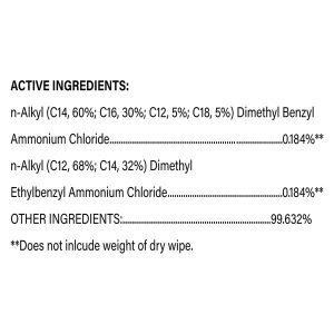 ACTIVE INGREDIENTS: n-Alkyl (C14, 60%; C16, 30%; C12, 5%; C18, 5%) Dimethyl Benzyl Ammonium Chloride: 0.184%**; n-Alkyl (C12, 68%; C14, 32%) Dimethyl Ethylbenzyl Ammonium Chloride: 0.184%**; OTHER INGREDIENTS: 99.632%; TOTAL: 100.000%; **Does not include weight of dry wipe. BLEACH FREE.