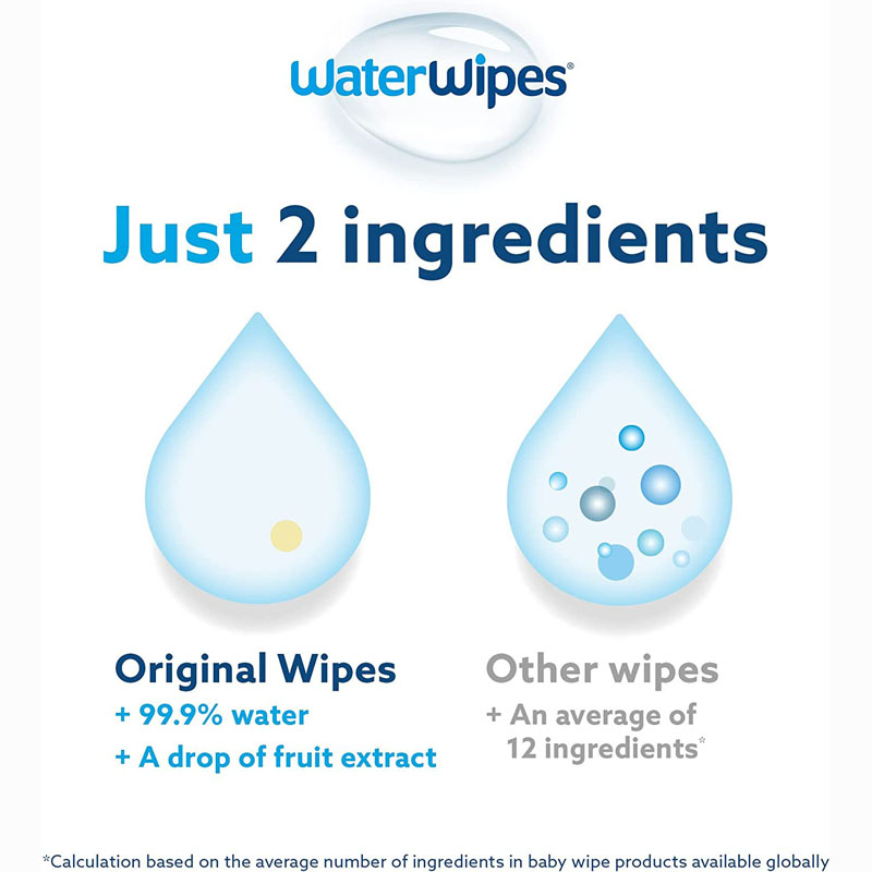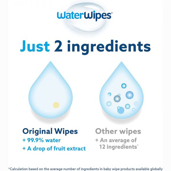 While other wipes have as many as 12 ingredients, WaterWipes Original Wipes are made using only 99.9% purified water and a drop of fruit extract.