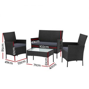 Meticulously crafted, our 4-piece Wicker Outdoor Set comprises a chic loveseat, two single armchairs and one matching side table for a beautiful integrated look. Its presence will definitely add panache and style to your deck, patio or even living room. Made of eco-friendly PE wicker and a sturdy steel frame, this set is designed to last through all weather and the test of time. The 5mm tempered glass top for the side table also ensures a strong and safe use with total peace of mind. Not least, the cushion covers are removable and washable to maintain their pristine appearance.
