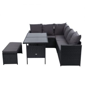 Invite your friends and family over for a garden party or just sit back and relax with our Outdoor Sofa Dining Set. Being a 9-seater, the dining set provides enough room for all your guests to sit or for you to have a lie down and enjoy a book. You can arrange the seats in various ways depending on your needs and there are hooks included to secure the seats firmly together. The sofa is made of sturdy powder-coated steel frame with quality PE wicker finish that not only looks stylish but is perfect for outdoor use as it is both UV-resistant and weather-resistant. The cushions and pillows on the sofa provide ultimate comfort and are water-resistant as well. The set also includes a matching table that has a 5mm tempered glass top with buffers for added protection. Choose from four stylish models to suit your requirements.