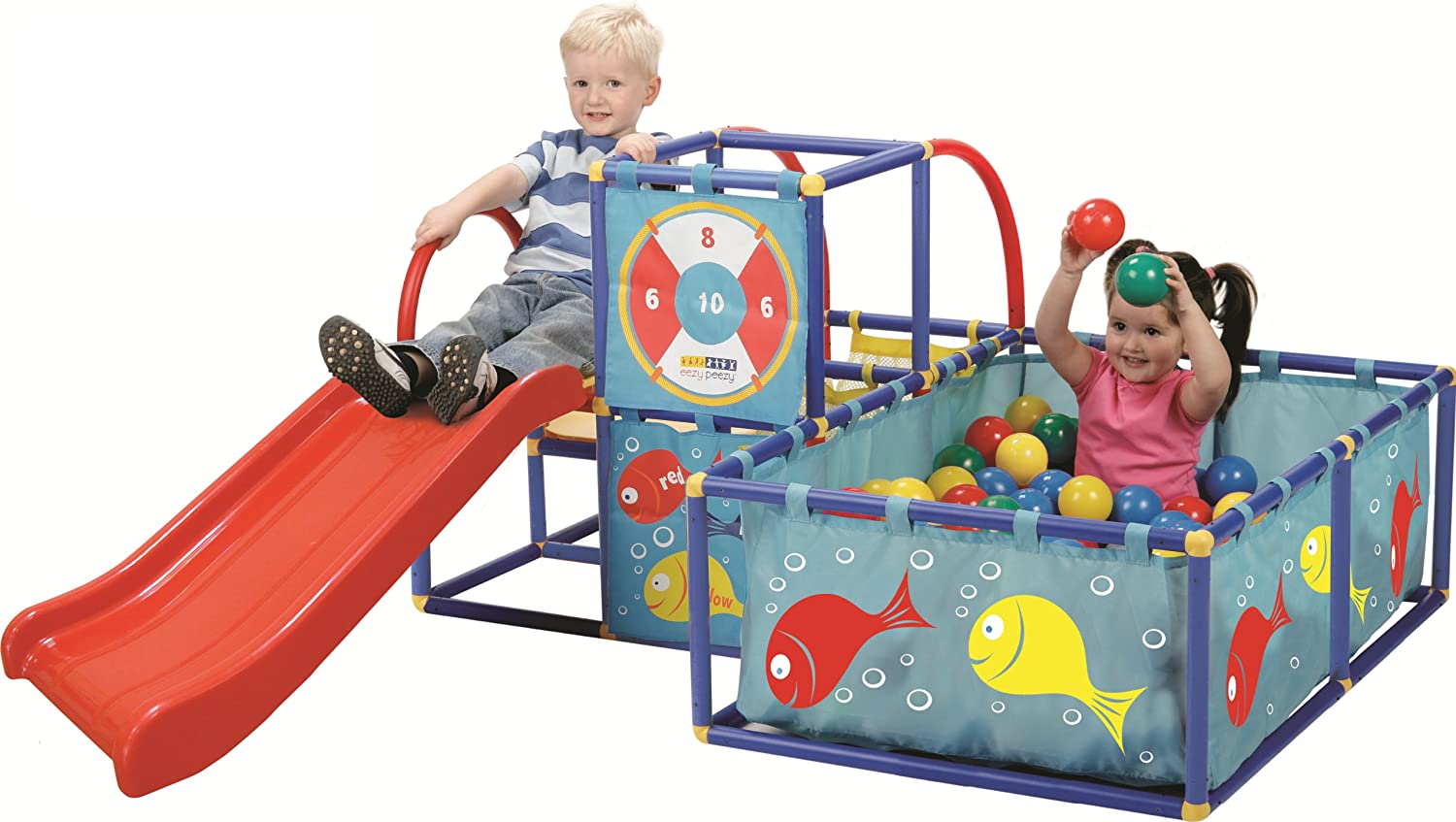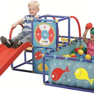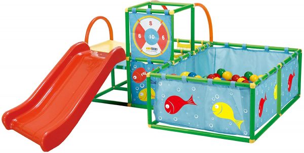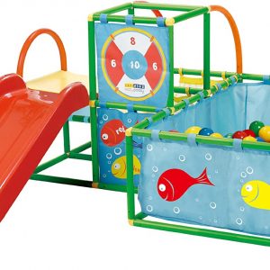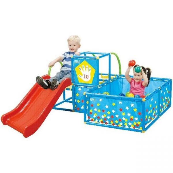 Fun and safe ball pit, slide, toss target with colorful balls, this Active Play 3 in 1 Gym Set will quickly become a favorite in playtime! Made from safe and sturdy high-quality plastic construction, featuring durable interlocking plastic tubes and connectors with double self: locking springs. Easy assembly for hours of fun and active unplugged play in your playroom for years of playtime enjoyment. The only limit is there imagination. Toddlers will enjoy their Active Play 3 in 1 Gym Set so much that it just might wear them out! But… only until after nap time! Includes: Ball Pit, Super safe Slide, Toss Target and 50 Colorful Balls. Dimensions: 56 x 62 x 29 inches. Weight: 20.3 lbs. Maximum load: 150 lbs. For ages: 1 to 3. Assembly required.