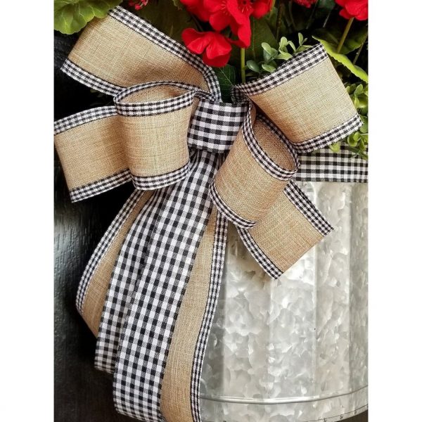 ?The bucket wreath features beautiful red geraniums and assorted greenery. It is finished off with a check and natural bow.?