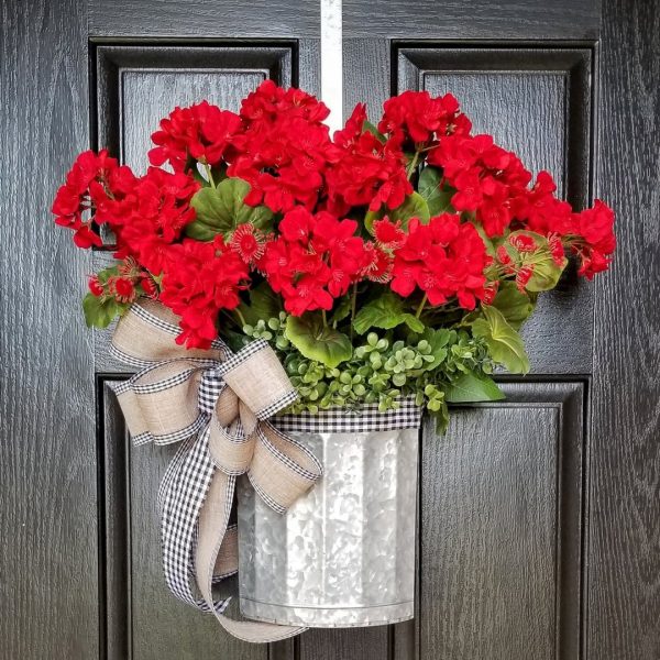 ?Red Geranium bucket wreath for front door. This bucket wreath is very warm and welcoming. You are going to love this on your front door!?