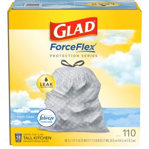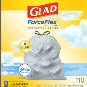 Glad ForceFlex Tall Kitchen Drawstring Trash Bags, 13 Gal, Fresh Clean Scent with Febreze, 110 Ct