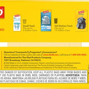 - 13 GALLON PLASTIC TRASH BAGS: Glad Tall Kitchen Drawstring Trash Bags with stretchable strength, traps, locks and neutralizes odors to keep your kitchen smelling fresh with a Fresh Clean scent; Package may vary