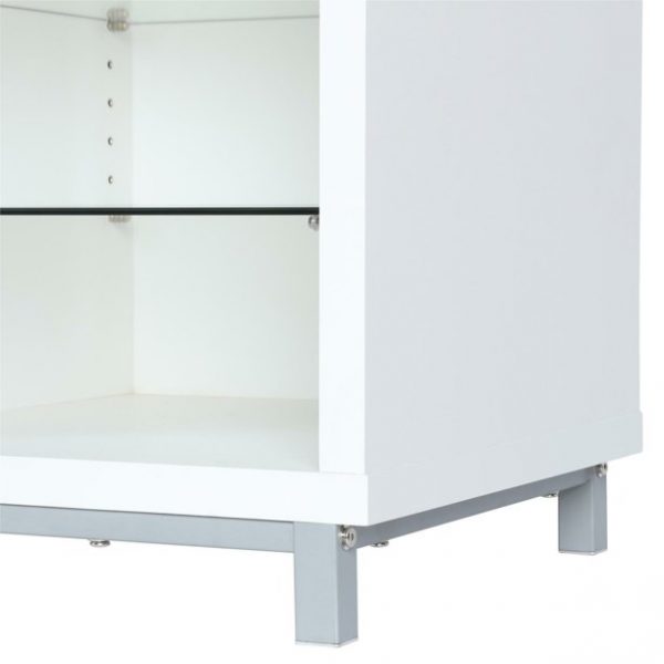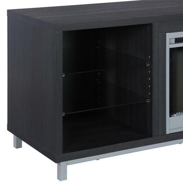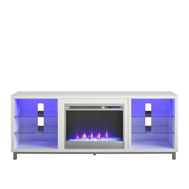 On either side of the fireplace insert are three shelves, 2 glass, that hold your entertainment components like gaming systems, a DVD player, remotes and more. Both of the side shelves are illuminated with blue lights to coordinate with the glowing fireplace for color options white, black oak, and gray. The remaining color options have side shelves illuminated with LED lights with 7 different color settings. These lights can be turned off if you prefer not to have them on. This Fireplace TV Stand has a mix of laminated particleboard, MDF and hollow-core construction with metal feet and tempered glass shelving.