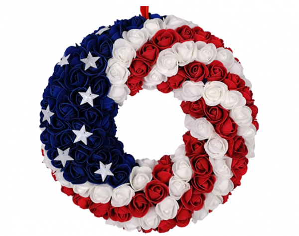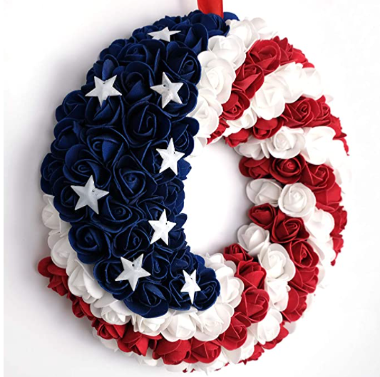 This Roses Patriotic Wreath uses the same color scheme as the American flag. Made of foam and metal, the color of the patriotic wreath is very bright and beautiful, it is not easy to fade. Good choice for your front door decoration