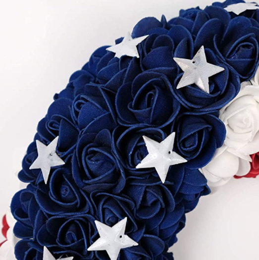 Composition: This Roses Patriotic Wreath uses the same color scheme as the American flag. Made of foam and metal, the color of the patriotic wreath is very bright and beautiful, it is not easy to fade.