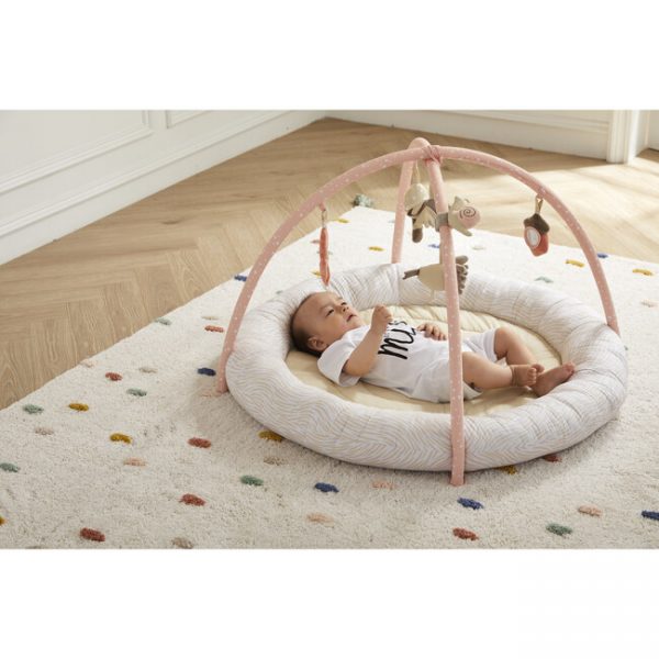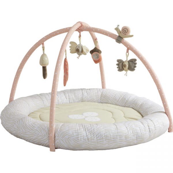 Baby will never want to leave the nest when they play on our Nest Baby Activity Gym. Soft, cushiony mat has a super soft outer poly filled ring to help keep them in place. When baby is on her back, she can reach for the sweet rattles, which are removable and perfect for travel. Or remove the activity bar so baby can take a nap. For use on the floor only. Never leave baby unattended.