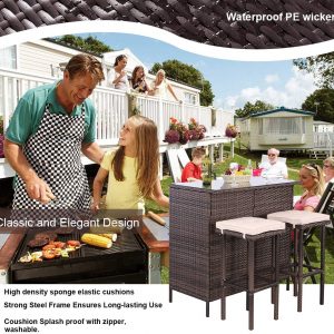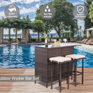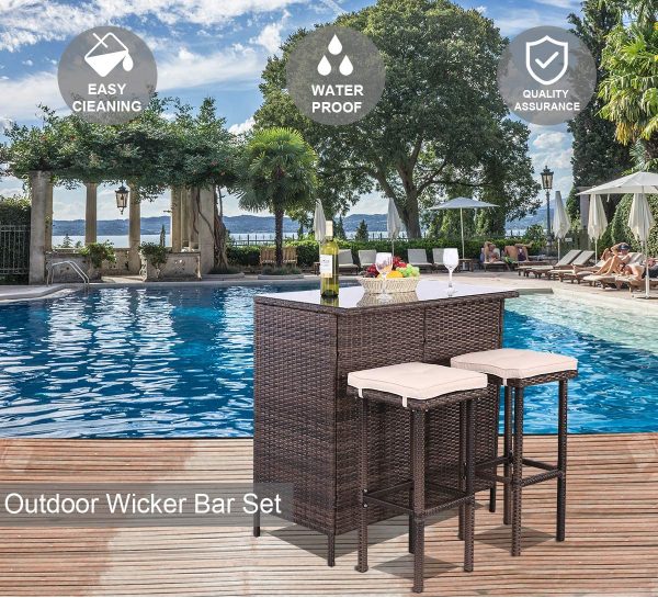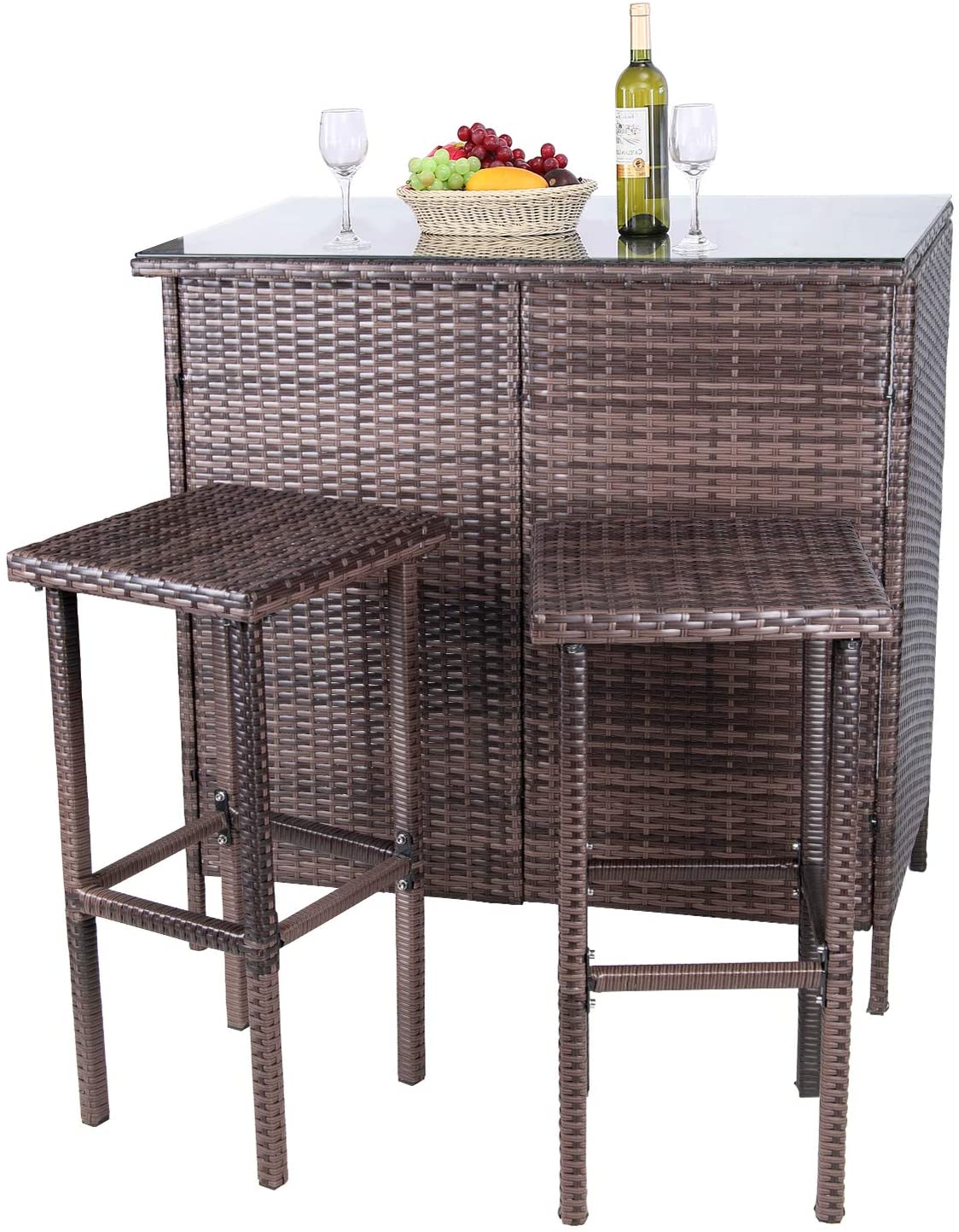 Polar Aurora 3PCS Patio Bar Set with Stools and Glass Top Table Patio Wicker Outdoor Furniture