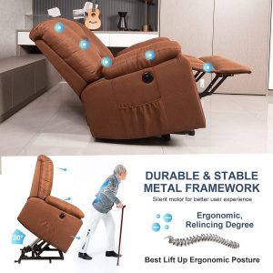???UL Approved Silent Lift Motor?? ?C With our powerful silent lift motor, our lift chair can pushes the entire chair up to help the senior stand up easily without adding stress to back or knees. Design of right arm control button, our lift recliner chair reclines up to 140 degrees,the footrest and backrest are extended or retracted Simultaneously. You can smoothly adjust to customized position and stop lifting or reclining at any position you needed.