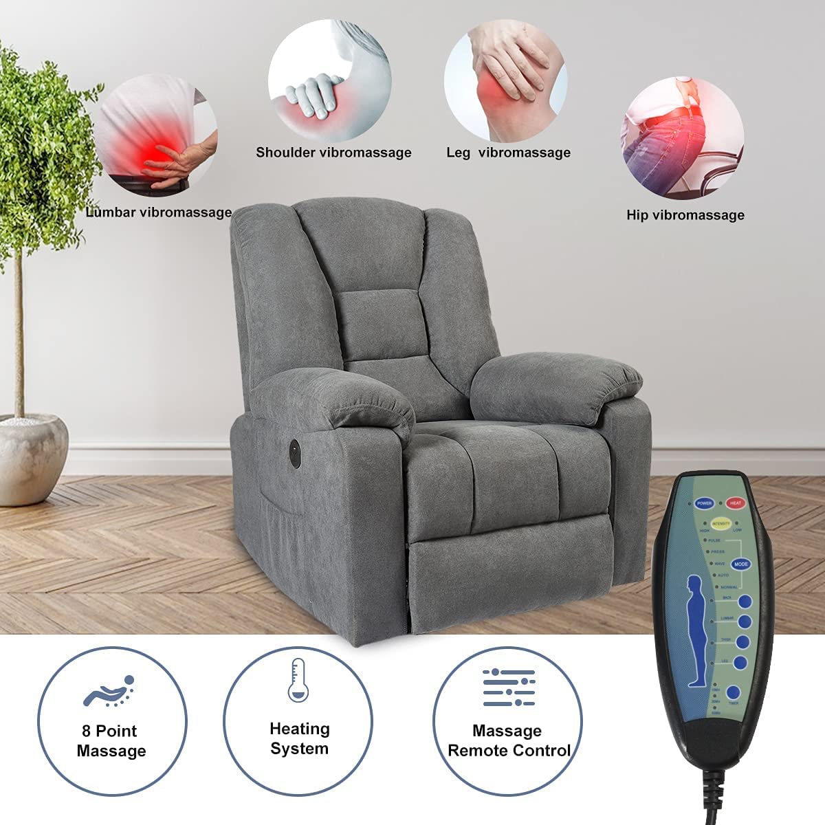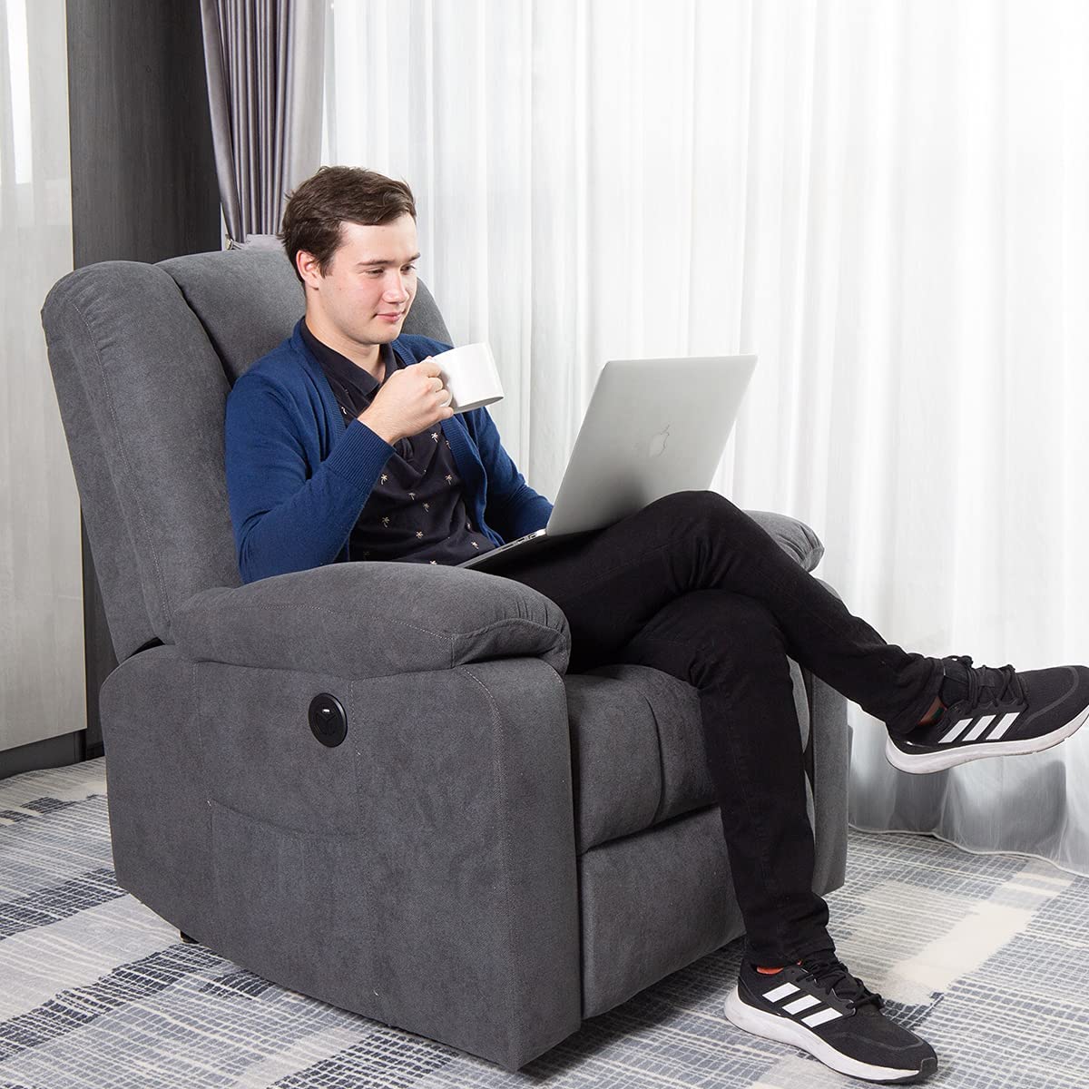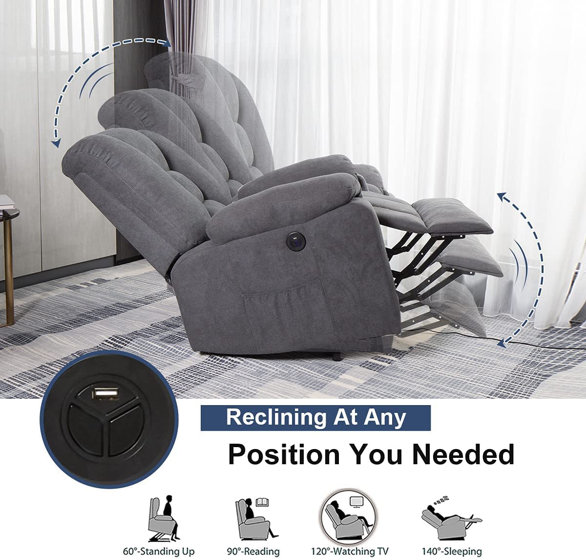 ???Heated Vibration Massage & USB Outlet?? ?C This chair come with 4 areas of massage(shin, thigh, lumbar, head) and 5 modes( pulse, press, wave, auto, normal). Extra USB charging port will allow you charging your devices during you sitting or reclining. Which is functional for optimal comfort, perfect for reading, sleeping or napping. (Note:The USB ports ONLY for Low-Power devices, such as Phone, iPad or Headset.)
