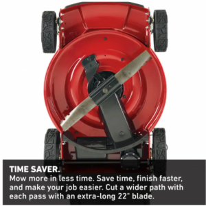 - Time Saver. Mow more in less time, Save time, finish faster, and make your job easier. Cut a wider path with each pass with an extra-long 22 in. blade.