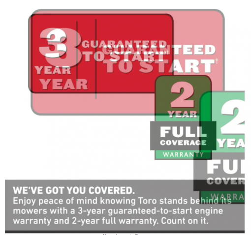 - We’ve Got You Covered. Enjoy peace of mind knowing Toro stands behind its mowers with a 3-year guaranteed-to-start engine warranty and 2-year full warranty. Count on it.