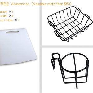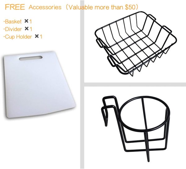 Free Accessories including Divider (can be used as a cutting board), Basket (To keep dry and wet separate), and cup holder (enjoy your drink, no worry tipping). Accessories are free, but all heavy duty material used.