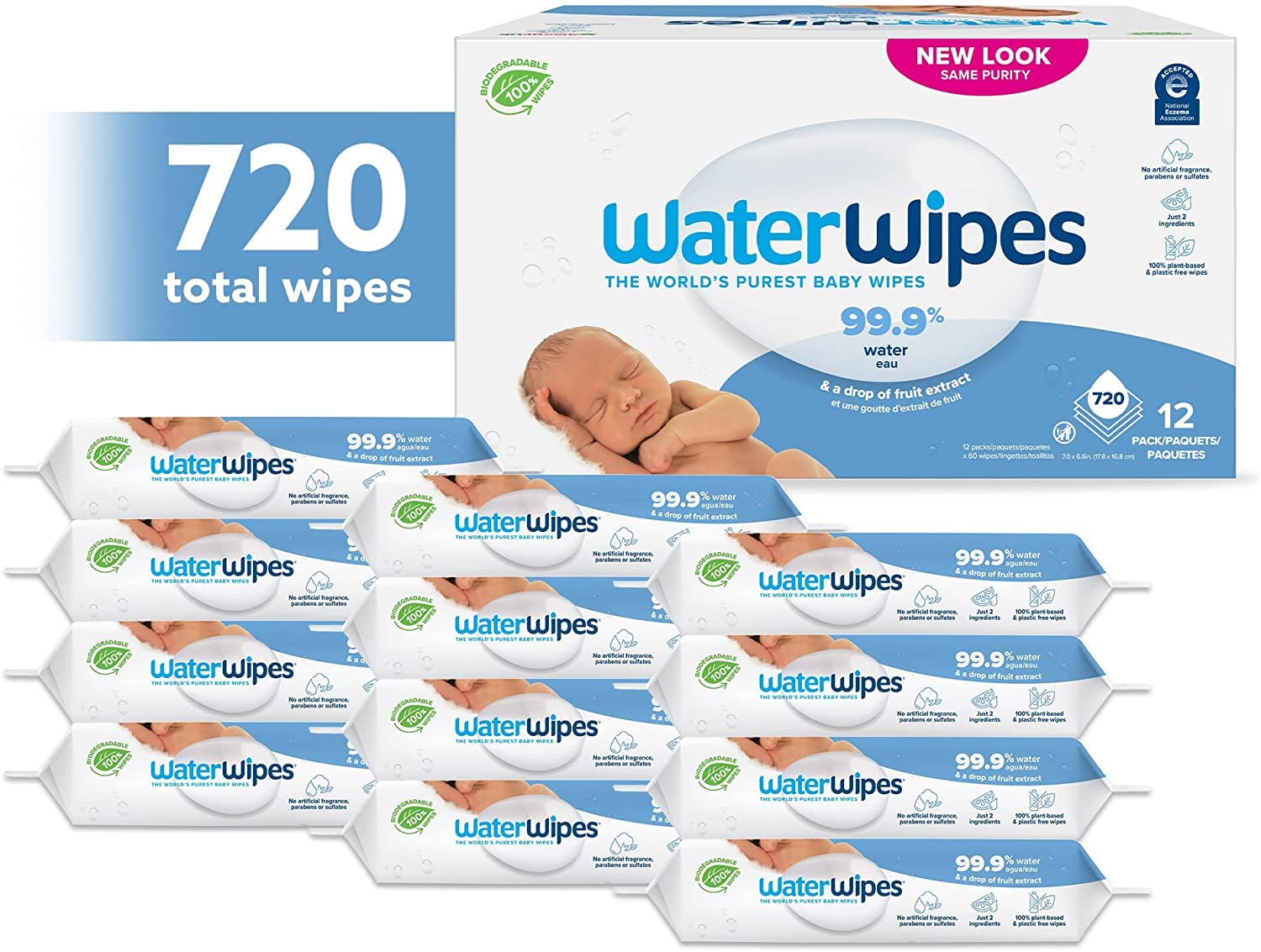 WaterWipes Plastic-Free Original Baby Wipes, 99.9% Water Based Wipes, Unscented & Hypoallergenic for Sensitive Skin, 720 Count (12 packs)