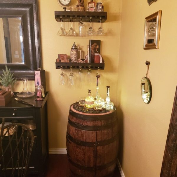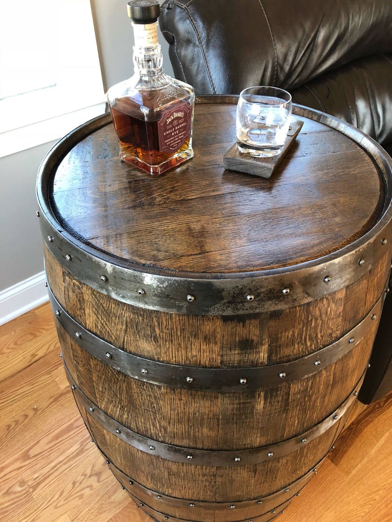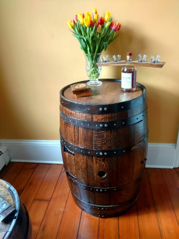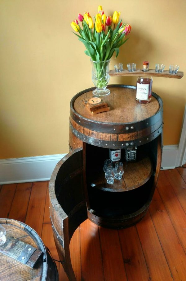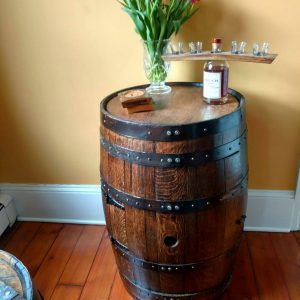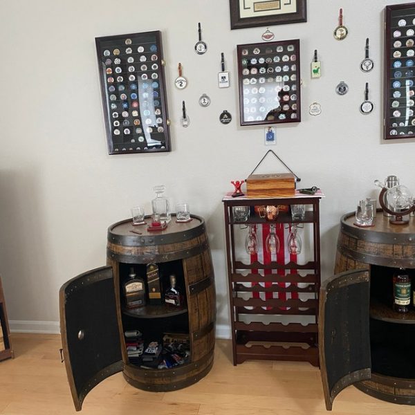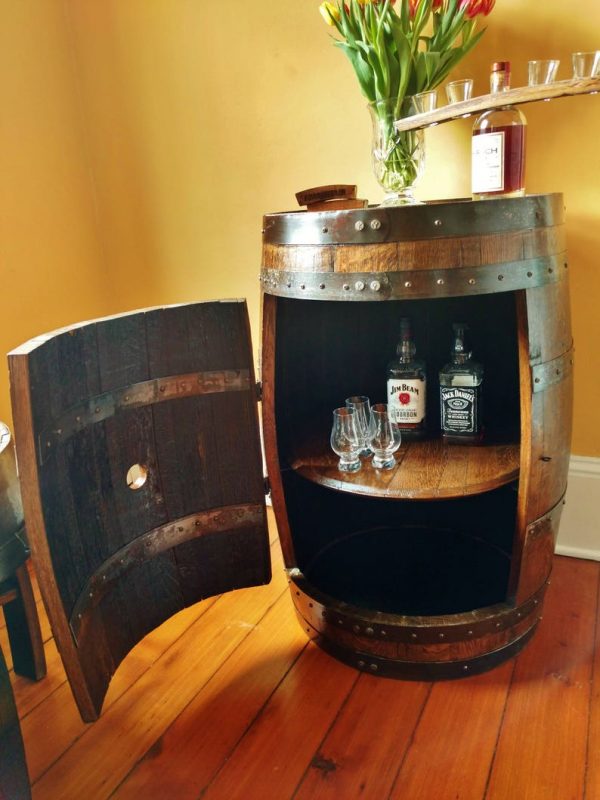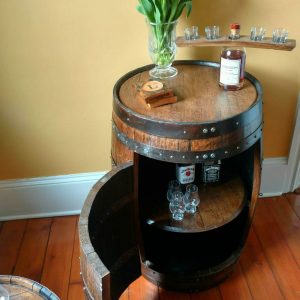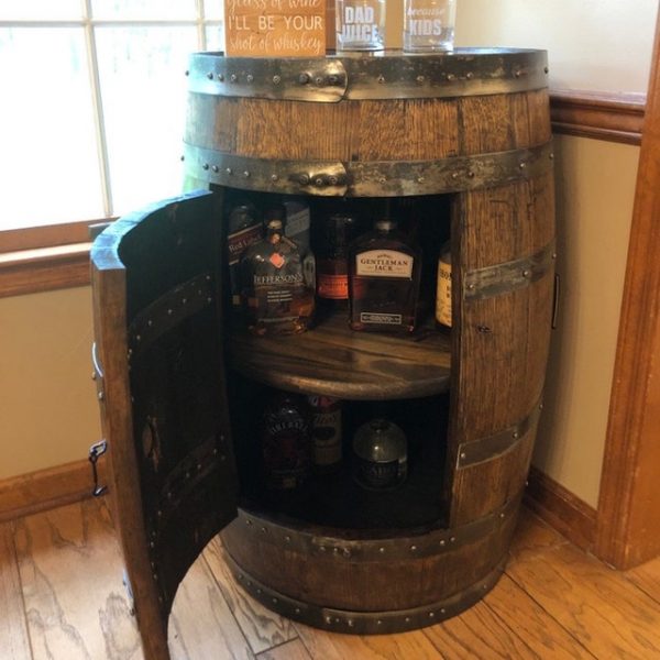 Handcrafted Whiskey / Bourbon Barrel Cabinet, made from an authentic oak Whiskey barrel. Because these cabinets are crafted using actual used Whiskey barrels, there will always be unique variations to the look and colors of the finished barrels. This gives them the sought after, rustic look that is unable to be duplicated. Each cabinet is hand sanded, stained, and finished with a coat of polyurethane.