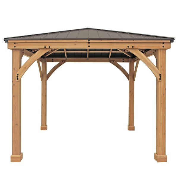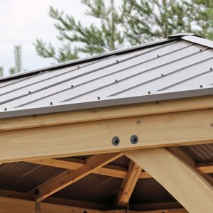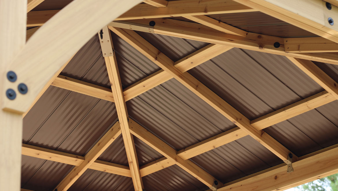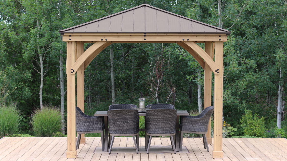 Extend your living space outdoors with our 10?? x 10?? Meridian Gazebo. This wooden gazebo with aluminum roof is the perfect addition to any backyard space. Design your dream backyard oasis and add the final touch to your patio design or complete your poolside deck. There is no outdoor space that this room won??t compliment.